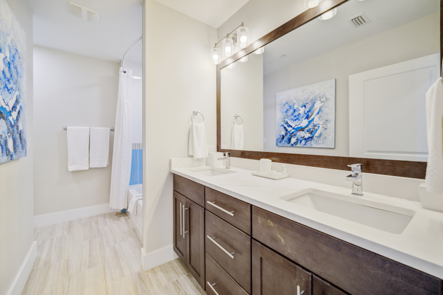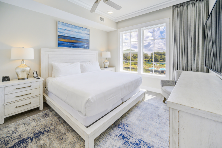 Enjoy unparalleled views of the Gulf of Mexico and Henderson’s welcoming amenities from your private balcony. Enjoy our tropical pools and meandering lazy rivers. Timeless decor and aquamarine-colored details evoke blissful moments by the sea. Features a sunken tub with a unique window and two queen beds.